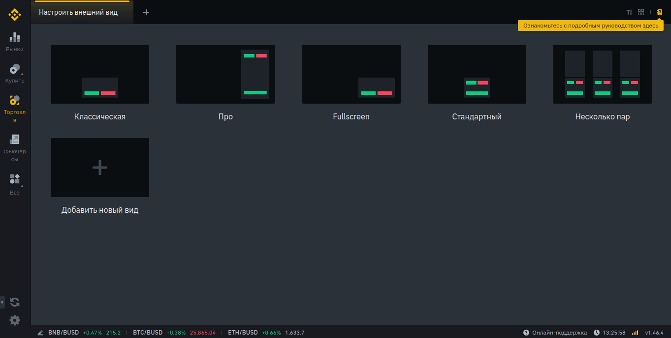 Как и в случае со спотовым рынком, при первом запуске необходимо выбрать внешний вид окна терминала для получения доступа ко всем активам и инструментам деривативной фьючерсной секции.