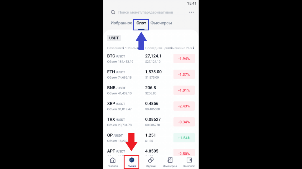 - Чтобы начать торговлю, необходимо нажать на раздел “рынок” и выбрать торговый инструмент (спот, фьючерс или опционы), интересующий актив и нажать на него, что откроет окно с детальной информацией, включая текущую цену, графики изменения стоимости и новости рынка, связанные с активом.