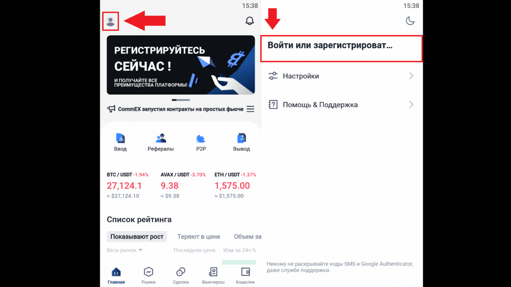 Торговля в мобильном приложении CommEX начинается с беспрепятственной регистрации и входа в аккаунт. После этого пользователи переходят к главной странице, где доступны различные торговые инструменты и активы, включая базовые криптовалюты, простые и бессрочные фьючерсы.