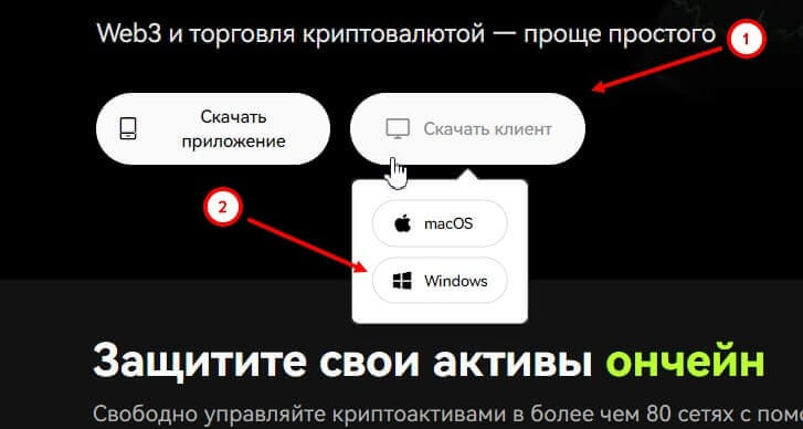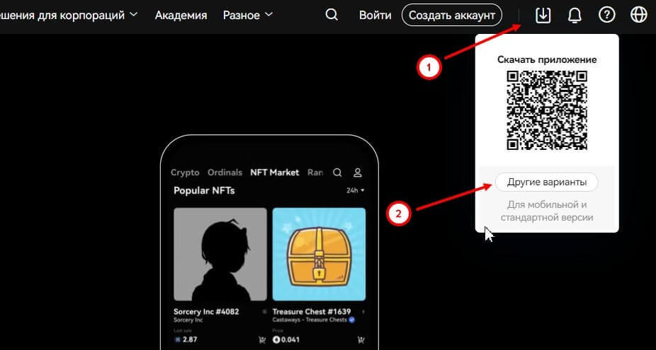 Чтобы скачать программу для ПК или мобильного телефона, необходимо перейти на официальный сайт OKX и в верхней части страницы и нажать на кнопку “Другие варианты”.