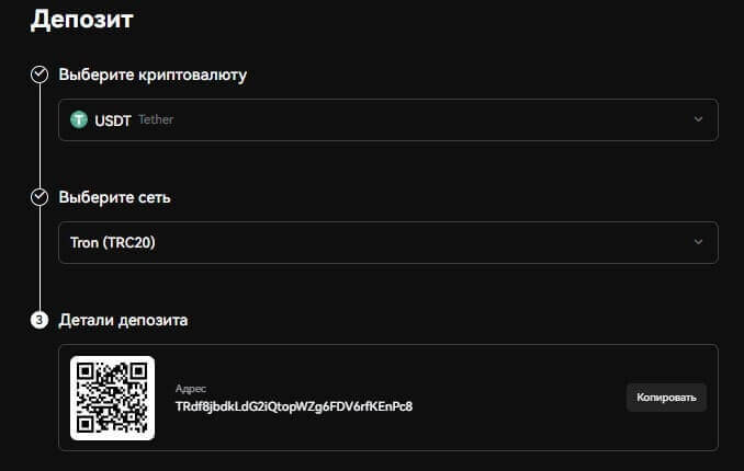 - Пополнение счета. Blofin поддерживает различные криптовалюты, выберите подходящую, в том числе и сеть и переведите её из стороннего кошелька, где вы храните активы на свой основной счет платформы.