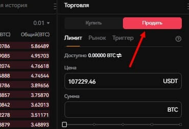 - Продажа на споте ведется в этой же странице – нужно выбрать пункт “Продать” (находится выше выбора типов ордера) и выполнить все те же действия выше (с 5 по 7 шаг).
