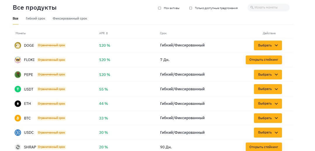 Каждый сможет отфильтровать предложения, например, выбрать гибкий срок или фиксированный в верхней части экрана. Можно открыть только те предложения, доступные пользователю. А активировав галочку в пункте “мои активы”, можно найти предложения под монеты, имеющиеся в вашем инвестиционном портфеле.