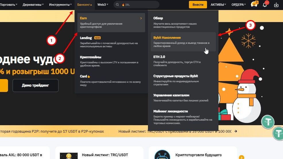 Чтобы перейти в раздел, наведите мышкой на пункт «Банкинг» в главном верхнем меню, и во всплывающем меню выберите “Earn”, а затем во всплывающем меню выберите “ByBit накопления”.
