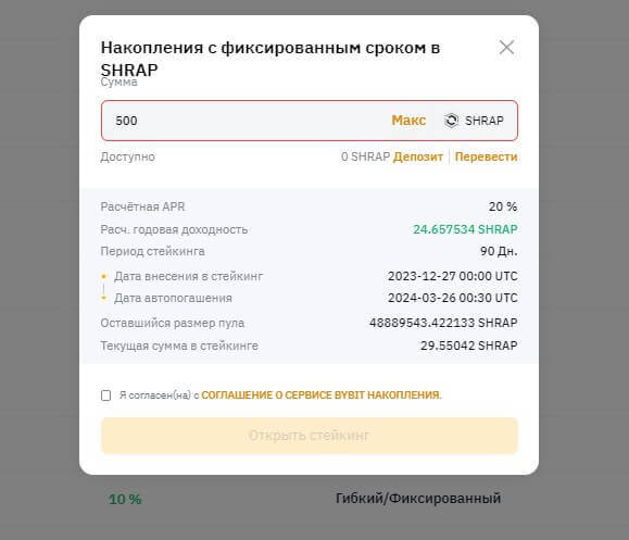 После того, как пользователь определился и выбрал определенный вариант стейкинга следует открыть его, нажав на кнопку “Открыть стейкинг”. Появиться окошко, где нужно указать сумму монет, планируемую для внесения в стейкинг. Можно нажать на кнопку “Макс”, если планируете отправить на стейкинг все монеты. Ниже можно увидеть расчетную ARP, годовая доходность, период стейкинга и прочую информацию.