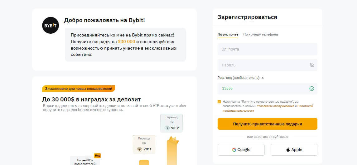 Прежде чем отправить монеты на стейкинг на сайте торговой площадки БайБит, важным моментом станет создание аккаунта. Подробно о процедуре регистрации мы рассказали в другой нашей статье по ссылке. Рекомендуем ознакомиться после изучения данного материала. Отметим, что каждый получает бонус после регистрации до 30 000 долларов в качестве награды от ByBit.