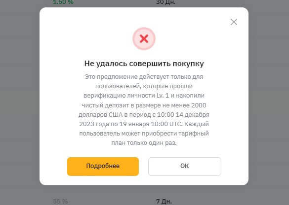 Перед клиентом появиться список продуктов, доступных для инвестиций с разным уровнем ARP, доходящая вплоть до 120% годовых на фиксированный срок. Но, часть требуют выполнение определенных критериев – при выборе стейкинга ETH на 7 дней под 44% годовых вылезает ошибка.