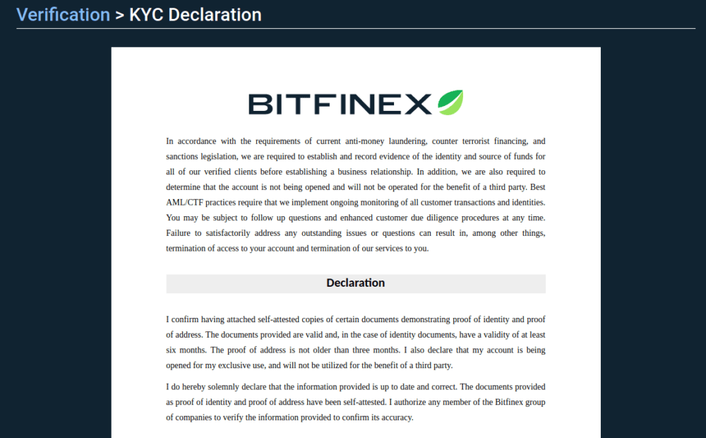Рекомендуется всем членам биржи Bitfinex, желающим полностью использовать все имеющиеся функции, пройти процесс верификации Bitfinex.com для получения полного доступа к инструментам торговли, управления своим аккаунтом и некоторым преимуществом при решении проблем и обращении к службе поддержки.