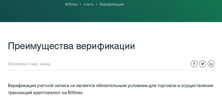 По этой причине советуем всем, кто собирается работать с биржевыми инструментами Bitfinex всерьез и надолго, сразу же после прохождения регистрации запускать проверку. Тем не менее, и без нее начать свою торговую деятельность здесь можно, это подтверждается самой биржей.