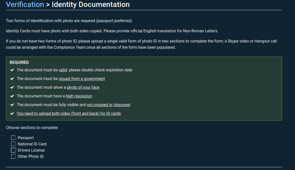 Для успешной верификации Bitfinex.com необходима отправка как минимум двух из предлагаемых типов документов.