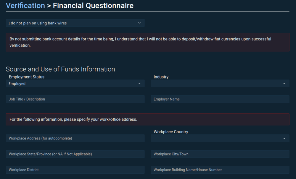 После заполнения всех обязательных блоков начинается процесс верификации. Как уверяет официальный сайт биржи, она занимает не более чем 3 рабочих дня, с момента получения полного пакета документов. Важно отметить, что при допущении ошибок при верификации может потребоваться повторное заполнение всех блоков раздела.