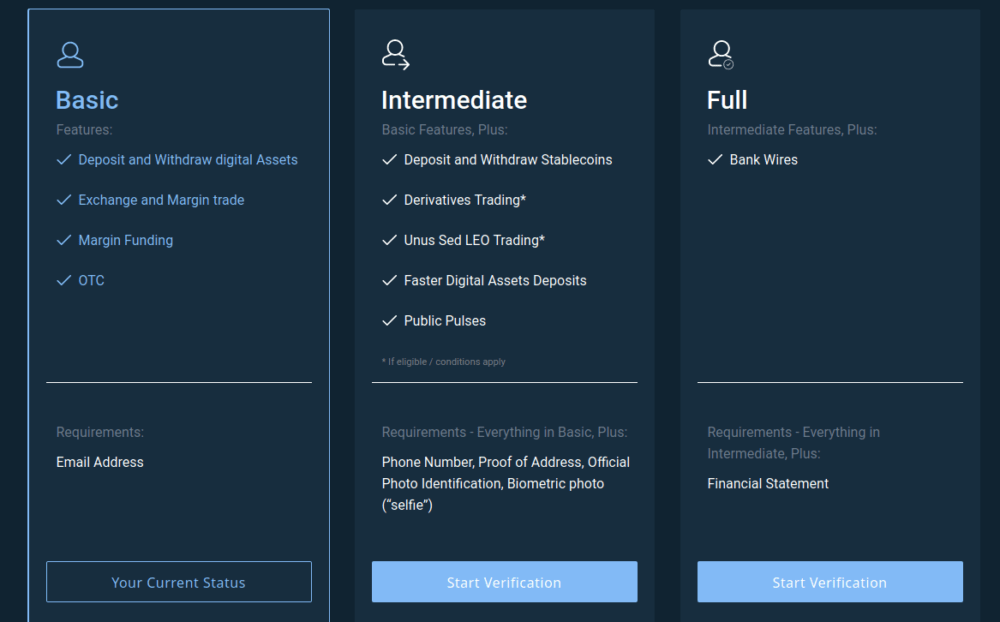 - Базовый — Basic. Дает пополнять и производить вывод без верификации только криптовалюты (с некоторыми исключениями по активам), проведения торговых и обменных операций в них же, маржинальную торговлю, трейдинг OTC (внебиржевая торговля, когда заключение сделок происходит, минуя биржевой прилавок).