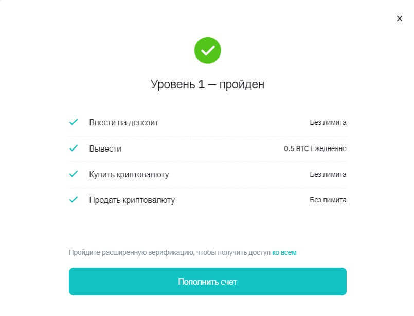После ввода информации появится всплывающее окно, что первый уровень верификации пройден и появятся возможности, открываемые перед пользователем – вывод повышается до 0,5 BTC, а также будет полностью доступна покупка и продажа криптовалют и внесение их на депозит без лимитов.
