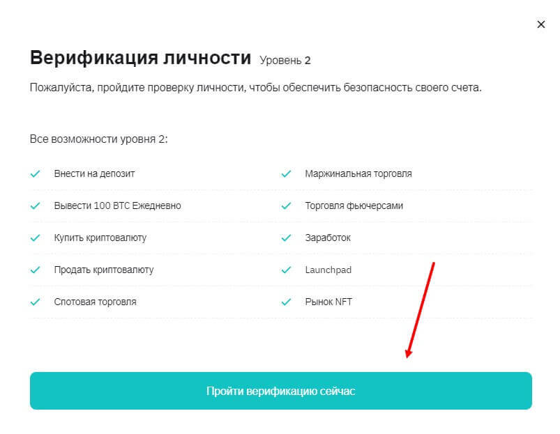 - Начните прохождение верификации. Откроется окно, где нужно нажать на кнопку “пройти верификацию сейчас”. Также в окне будут описаны все возможности для пользователя, в том числе повышение лимитов вывода до сотни BTC ежедневно, доступ к маржинальной торговли, лаунчпаду (Launchpad), сервисам пассивного заработка и списку открытого голосования.