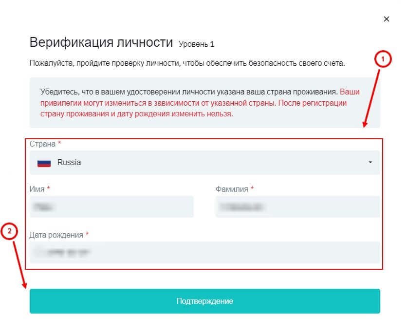 - Заполните информацию. Откроется окно, где важно выбрать страну проживания, указать имя и фамилию и выбрать дату рождения. Затем нажмите на “Подтверждение”.