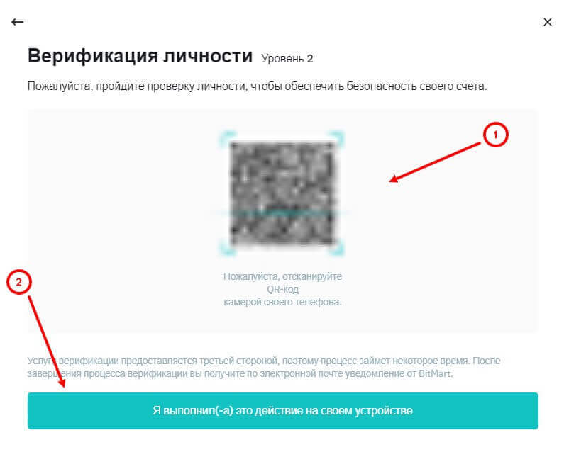 - Откроется QR-код, который будет необходимо отсканировать пользователям на своём смартфоне (расширенную верификацию можно пройти только через телефон). После перехода кликните на кнопку “Я выполнил(-а) это действие на своём устройстве”.