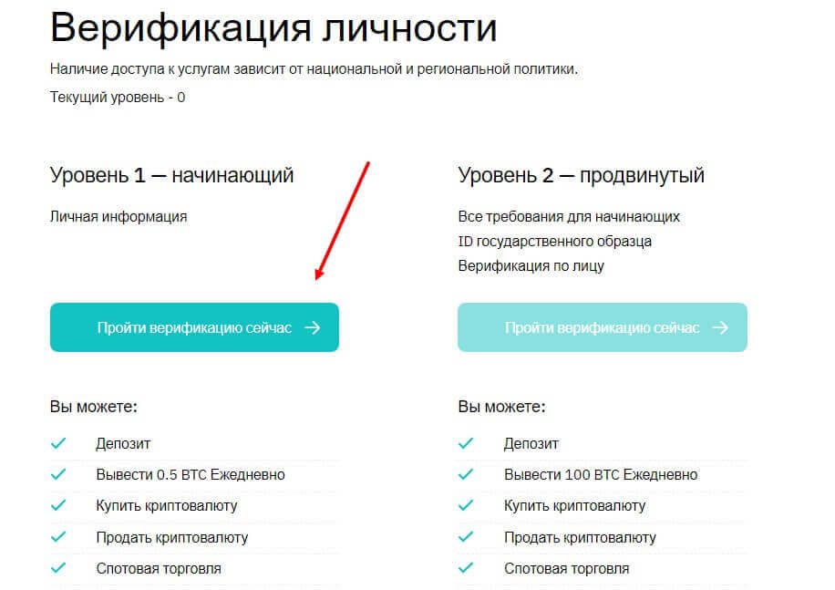 - Начните прохождение процедуры. Для этого нужно нажать на кнопку “пройти верификацию сейчас” под пунктом “Уровень 1 – начинающий”.
