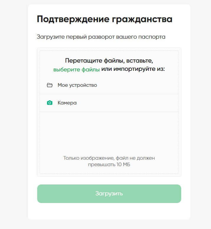 Затем нужно загрузить документы. Для этого в следующем окне нужно прочитать информацию и кликнуть на кнопку “Продолжить”. Затем нужно перетащить файлы и нажать на кнопку “Загрузить”. Важно, файл должен быть в хорошем качестве, а размер файла не превышать 10 мегабайт.
