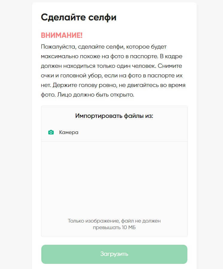 Затем нужно таким же образом подтвердить адрес прописки, добавив файл через загрузчик файлов. Последний этап – селфи. Для этого необходимо включить камеру и выполнить все условия. Также важно прочесть информацию, которая располагается выше. После того как селфи было сделано нажмите на кнопку “Загрузить”.