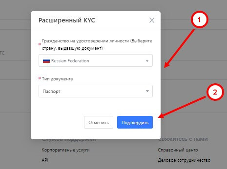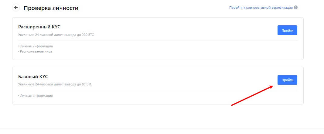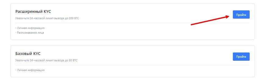 Как только данные были проверены, нужно пройти расширенный KYC. На странице “Проверка личности” нужно рядом с пунктом “Расширенный KYC” нажать на кнопку “Пройти”. После прохождения лимит будет увеличен до 200 BTC в сутки.