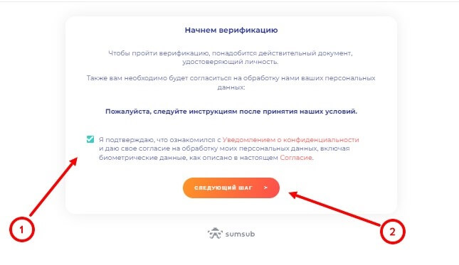 Затем откроется страница, где нужно подтвердить то, что пользователь ознакомится с условиями конфиденциальности, и согласие на обработку предоставленной персональной информации и нажать на красно-оранжевую кнопку “Следующий шаг” для продолжения верификации.