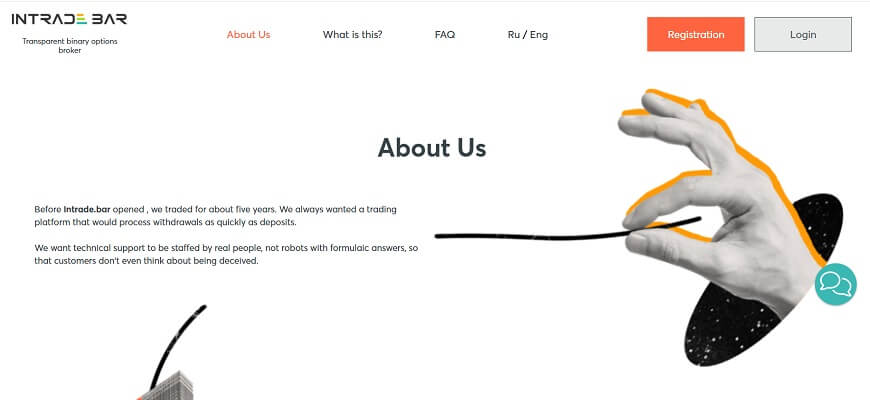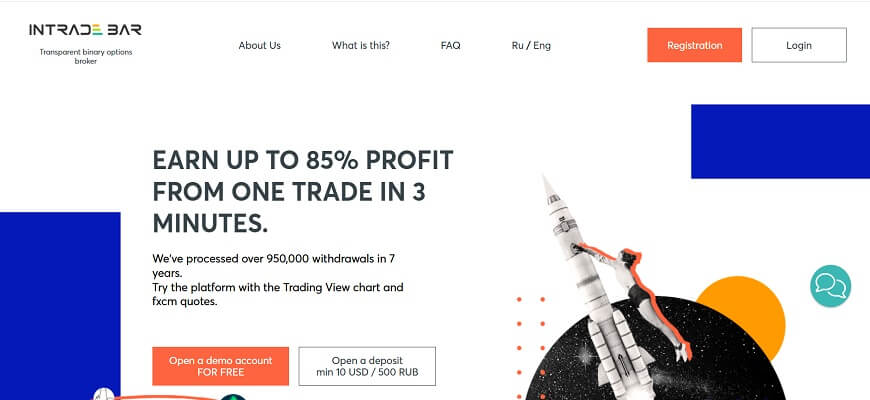 When opening the homepage of the official Intrade Bar website, we see an informational message about the possibility of earning 85% profit on a single trade and withdrawing the received profit within a few minutes. Over many years of its existence, the company has repeatedly confirmed its status as the most loyal and prompt participant in the “binary” market, fully fulfilling its obligations.