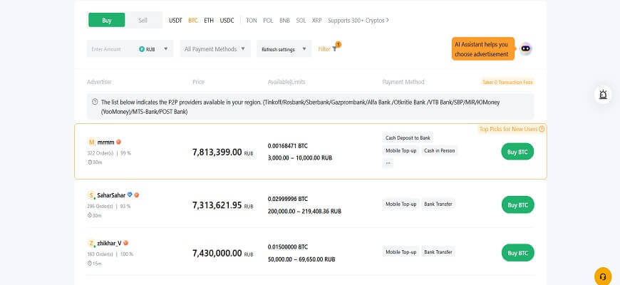On the next page, you’ll be presented with a choice of service providers and payment methods. Here, you can select the most advantageous option — sometimes using a bank card directly does not offer the best rates, or even the opposite. For example, through the Banxa service, with the same amount of funds in currency, you can purchase a larger volume of crypto assets.