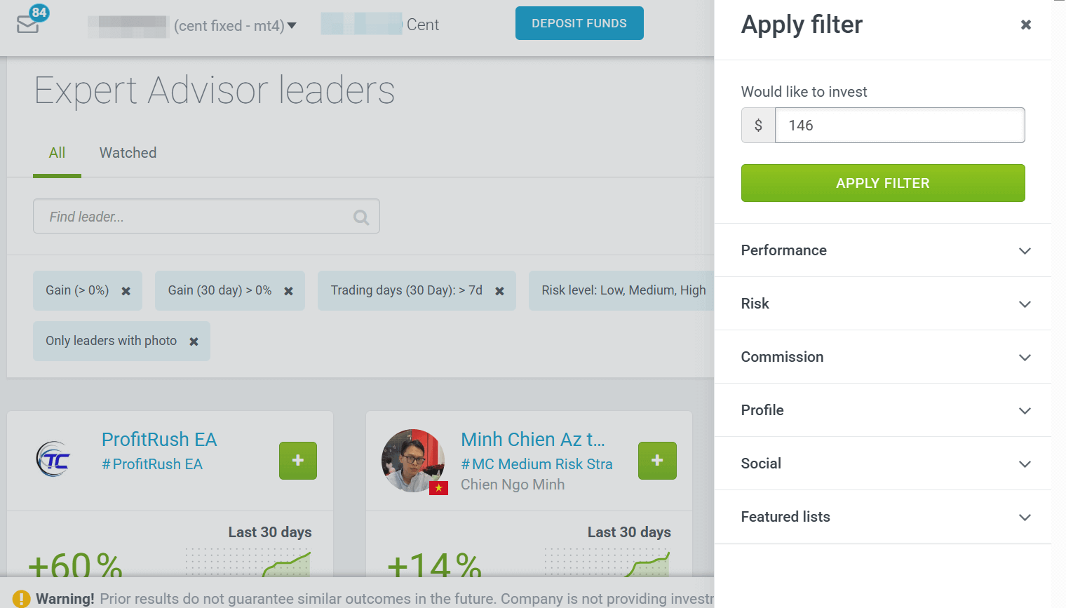 Like any investment activity, copy-trading involves the risk of losing investments. Risks may increase with the choice of a high-risk strategy. It is important to determine your risk level and choose a strategy accordingly.