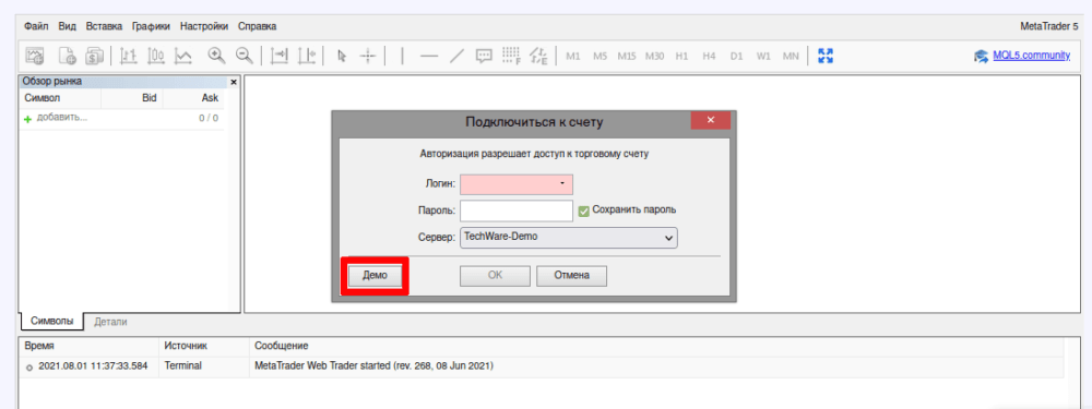В открывшемся интерфейсе появится окно для ввода идентификационной информации. В нем в нижнем левом углу будет представлена кнопка «Демо», с помощью которой и можно создать учебный аккаунт.