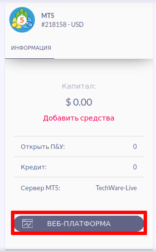 Впервые войдя в интерфейс личного кабинета, клиент попадает на страницу с информацией об имеющихся у него аккаунтах. Предоставляется возможность пополнения баланса и перехода в торговый веб-интерфейс. На текущий момент работа на демонстрационном депозите невозможна, такой тип учетки требуется предварительно создать.