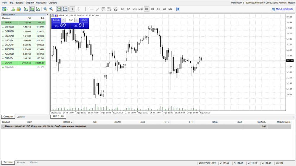 После завершения регистрации клиент попадает в стандартный интерфейс терминала Metatrader и может начинать совершать операции.