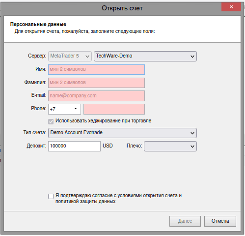 Процедура открытия демо счета EvoTrade хорошо знакома трейдерам, имеющим опыт взаимодействия с терминалом MT5. А тем, у кого такого опыта нет, разобраться во всех требованиях брокера не составит труда. Необходимо ввести имя и фамилию, адрес электронной почты и номер мобильного телефона. Затем выбираем желаемый объем баланса (минимальный депозит — $1000) и необходимое кредитное плечо, потому как пополнить созданный учебный аккаунт нельзя. Эти уровни рекомендуется устанавливать исходя их имеющихся в распоряжении средств, чтобы протестировать систему максимально приближенно к «боевым» условиям.