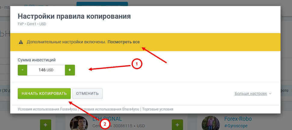 Укажите сумму копирования и нажмите на кнопку “Начать копировать”. Можно воспользоваться дополнительными настройками, нажав на “Посмотреть все” (располагается выше суммы инвестиций). Минимальная сумма инвестиций у каждого из трейдеров разная, например, в нашем случае от 146 USD.