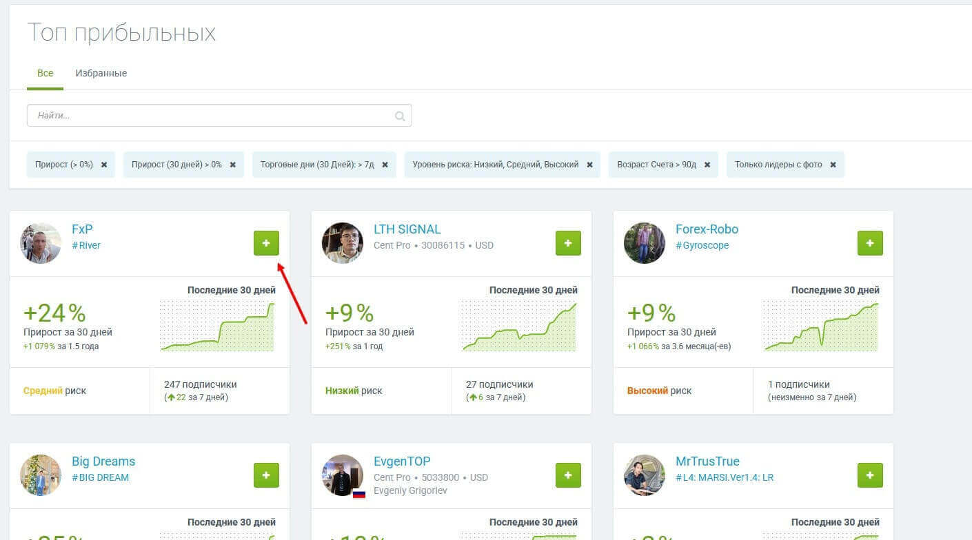 Перейдите в раздел “Панель управления” после пополнения счета. Чтобы скопировать, нажмите в разделе успешных трейдеров на кнопку “+”, рядом с трейдером (перед выбором можно увидеть прирост за 30 дней и за весь период).