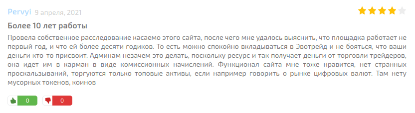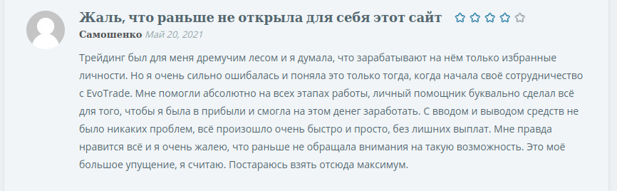 Особо ценна информация от начинающих клиентов, тем более если речь идет о биржевых игроках женского пола. Следующий фидбек — от такого клиента. Автор рассказывает, что до открытия депозита в Эво опыта торговли не было никакого. Казалось, что получать здесь профит могут только опытные, которых автор назвала «избранными». Однако углубившись в тему вопроса и произведя регистрацию аккаунта, она впоследствии получала всестороннюю помощь от специалистов EvoTrade, ведь для каждого нового биржевого игрока компания выделяет персонального помощника. После продолжительного периода заработка на биржевых сделках, был без лишних хлопот произведен вывод денег, особо указывается на отсутствие дополнительных комиссий, чем иногда грешат конкуренты.