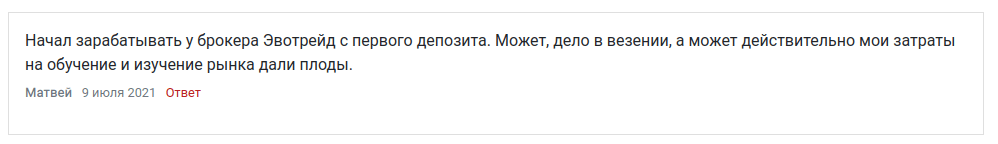 Открывает список отзывов трейдеров информация от опытного участника. Его история сотрудничества с Эво Трейд на момент написания фидбека включает в себя внушительные три года плодотворного сотрудничества. Стоит отметить, что немногие форекс брокеры в принципе успевают просуществовать такой период времени и сам факт нахождения в рынке три года говорит о стабильности компании, надежности и безопасности вложений в нее.