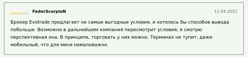 Следующий автор тоже является активным пользователем услуг EvoTrade. Он указывает на то, что предлагаемые компанией комиссии не относятся к числу самых выгодных среди конкурентов. Однако в данном случае важно также оценивать и такие факторы, как возможность заработка и скорость вывода. Множество владельцев реальных аккаунтов, и об этом будет рассказано далее, отмечают высокий уровень сервиса, в том числе и 100%-ю гарантию вывода денег. Не самые привлекательные комиссионные, хотя они и не являются самыми большими среди других подобных фирм, позволяют брокеру зарабатывать не на сливе депозитов своими клиентами, а непосредственно от совершения ими биржевых сделок. Это гарантирует то, что при первой же необходимости деньги со счета могут быть выведены без лишних препонов со стороны ЭвоТрейд.