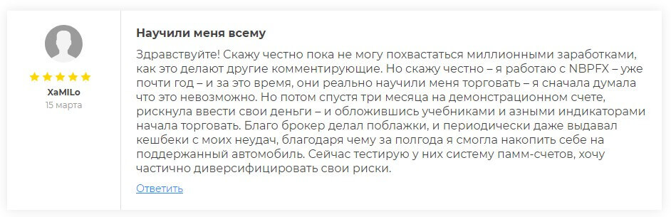Множество отзывов были оставлены на обычных форумах положительные, однако не обходится и без негативных. В первом рассматриваемом отзыве от пользователя XaMILo ясно видно о том, что платформа NPBFX может использоваться не только для профессиональных трейдеров, но и также начинающих. В своё отзыве она говорит о том, что система смогла научить всему, что нужно на форекс рынке. Постоянные кэшбэки с неудач при торговле также помогают пользователя отыграться и получить долгожданный заработок.