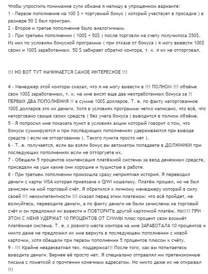 В первом попавшемся отзыве можно прочитать о том, что компания обманывает пользователей на бонусы. По его рассказу, после трех пополнений ему удалось наторговать на 250$ после третьего пополнения. Также пользователь писал, что откуда-то без причины начали появляться скрытые комиссии, не указанные в правилах проекта.