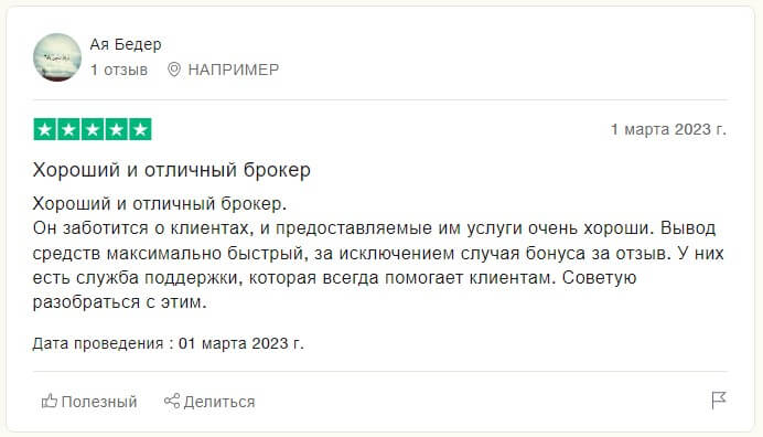 В одном из первых отзывов клиент из Франции высказался о том, что брокер является отличным: забота и качество предоставленных услуг – первое, над чем работает компания – высказал Ая Бедер. Поэтому в своём отзыве он рекомендует компанию для торговли.