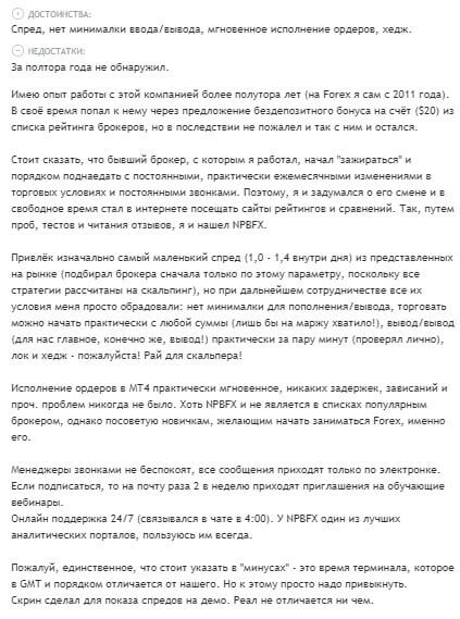 Из найденных положительных отзывов можно понять, что пользователя радует спред, используемый внутри дня может доходить до 1,0 – 1,4. Также человек рассказал, что нет минимальной суммы на ввод и вывод средств, а исполнение ордеров MT4 происходит практически мгновенно. Негативных сторон на торговой площадке NPBFX клиент не обнаружил.