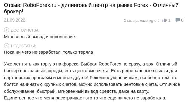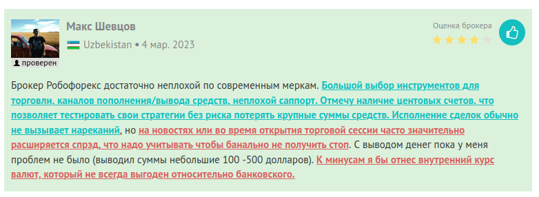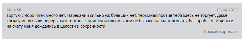 Следующий автор имеет внушительный опыт работы с Roboforex.com в качестве основного брокера, и за это время успел сформировать о нем положительное мнение. Из главных называемых им преимуществ — стабильность работы терминала без особых нареканий. Речь о том, что в условиях высокой волатильности некоторые торговые приложения «грешат» нередкими зависаниями и подтормаживаниями, что в конечном итоге оборачивается убытками для трейдеров. У рассматриваемой компании таких проблем замечено не было.