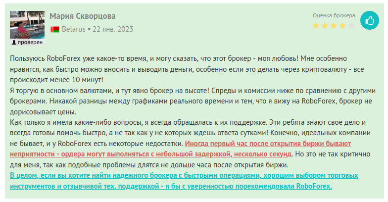 Завершим обзор мнением клиента, относящего Roboforex в список неоспоримых любимцев. Больше всего устраивает оперативный вывод денег на карту, что особенно оперативно получается при использовании криптовалюты — достаточно произвести вход в личный кабинет и отдать поручение брокеру на вывод. Тесная интеграция криптоактивов с классическими финансовыми инструментами — отличительная особенность многих современных брокеров, и Робо не перестает совершенствовать список финансовых возможностей для своих клиентов.