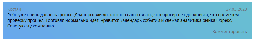 В следующем свежем отзыве фигурирует мнение о том, что лучшее подтверждение безопасности проведения операций в Roboforex — продолжительное время работы компании на рынке. С этим можно только согласиться, ведь информации о том, что очередная брокерская компания «пропала» вместе с клиентскими средствами — далеко не редкость.