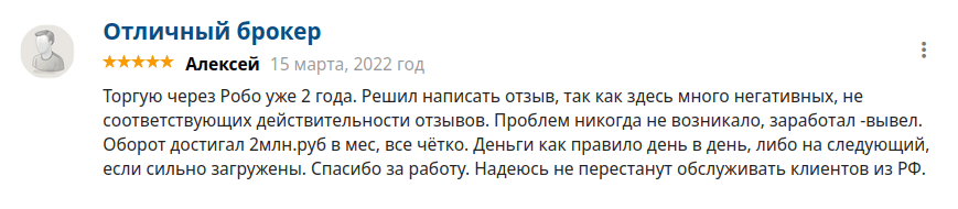 Следующий автор на момент публикации своего реального отзыва имел опыт работы с Робо в 2 года, за этот период он успел убедиться в отсутствии проблем. Имея оборот в 2 миллиона рублей, трейдер всегда имел возможность оперативного вывода средств, причем их поступление происходило на следующий рабочий день, как максимум, а иногда и в пределах текущего.
