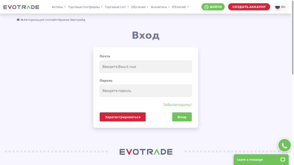 Все операции, как пополнения счета EvoTrade, так и снятия с него, производятся после входа в личный кабинет. Логин в него осуществляется через соответствующее меню на странице брокера, используя указанные данные для входа при регистрации.