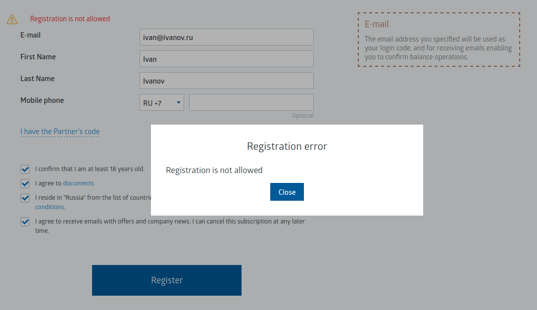 Обращаем внимание, что если при попытке регистрации нового аккаунта в списке дополнительных пунктов для согласия находится указано поле «I reside Russia …», это говорит о том, что геолокация пользователя определена как российская и даже при правильном вводе всех необходимых данных может появиться ошибка запрета создания аккаунта.