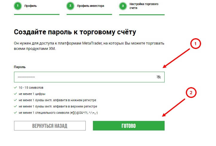 Последним маневром в мире трейдерства с брокером XM считается создание пароля к торговому счету, который должен также состоять из 10 – 15 символов. После ввода, нажмите на кнопку “Готово”.