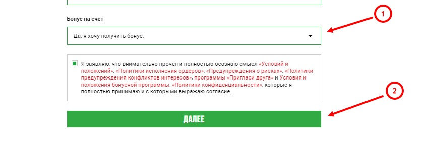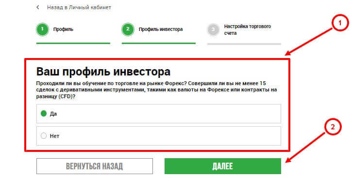 Во втором шаге вас спросят, проходили ли вы обучение на рынках форекс? Если да, то тогда нажмите на кнопку “Да”, если же вам необходимо обучение, то “Нет”. После этого нажимаете на кнопку “Далее”, чтобы продолжить процедуру создания личного аккаунта.