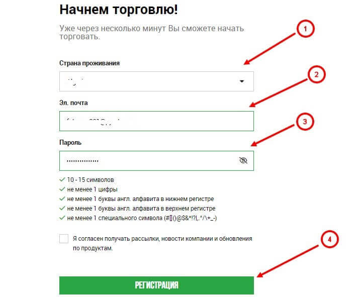 В конце также рекомендуется поставить галочку на пункте “я согласен получать рассылки, новости компании и обновления по продуктам”. Тем самым вы сможете получать необходимую информацию от администрации платформы. Для завершения процесса создания аккаунта нажмите на зеленую кнопку “Регистрация”.